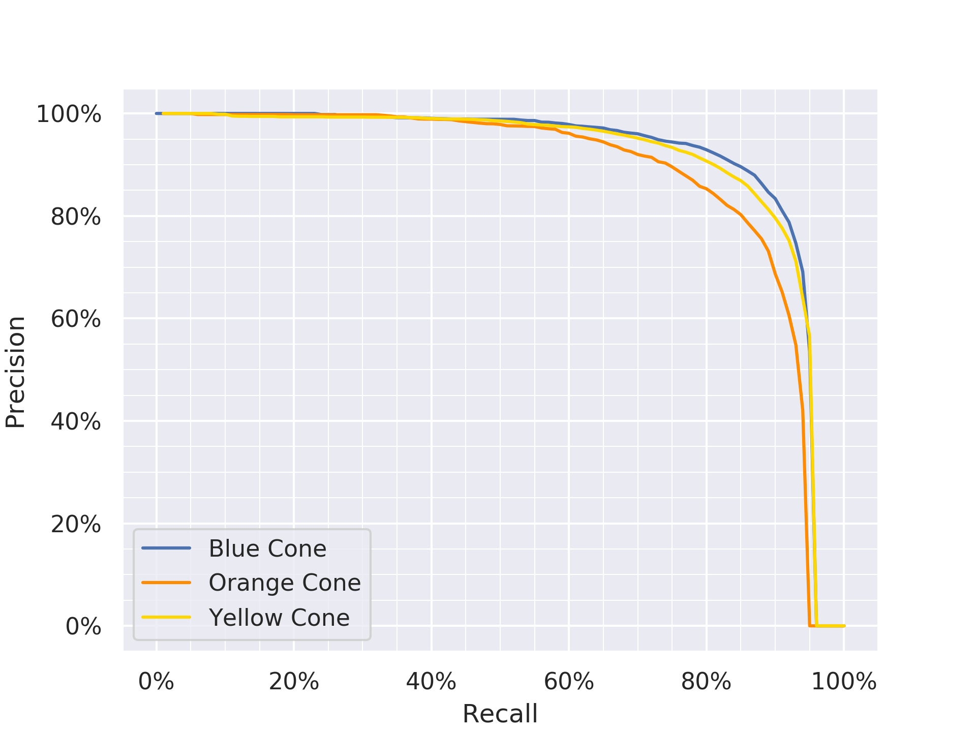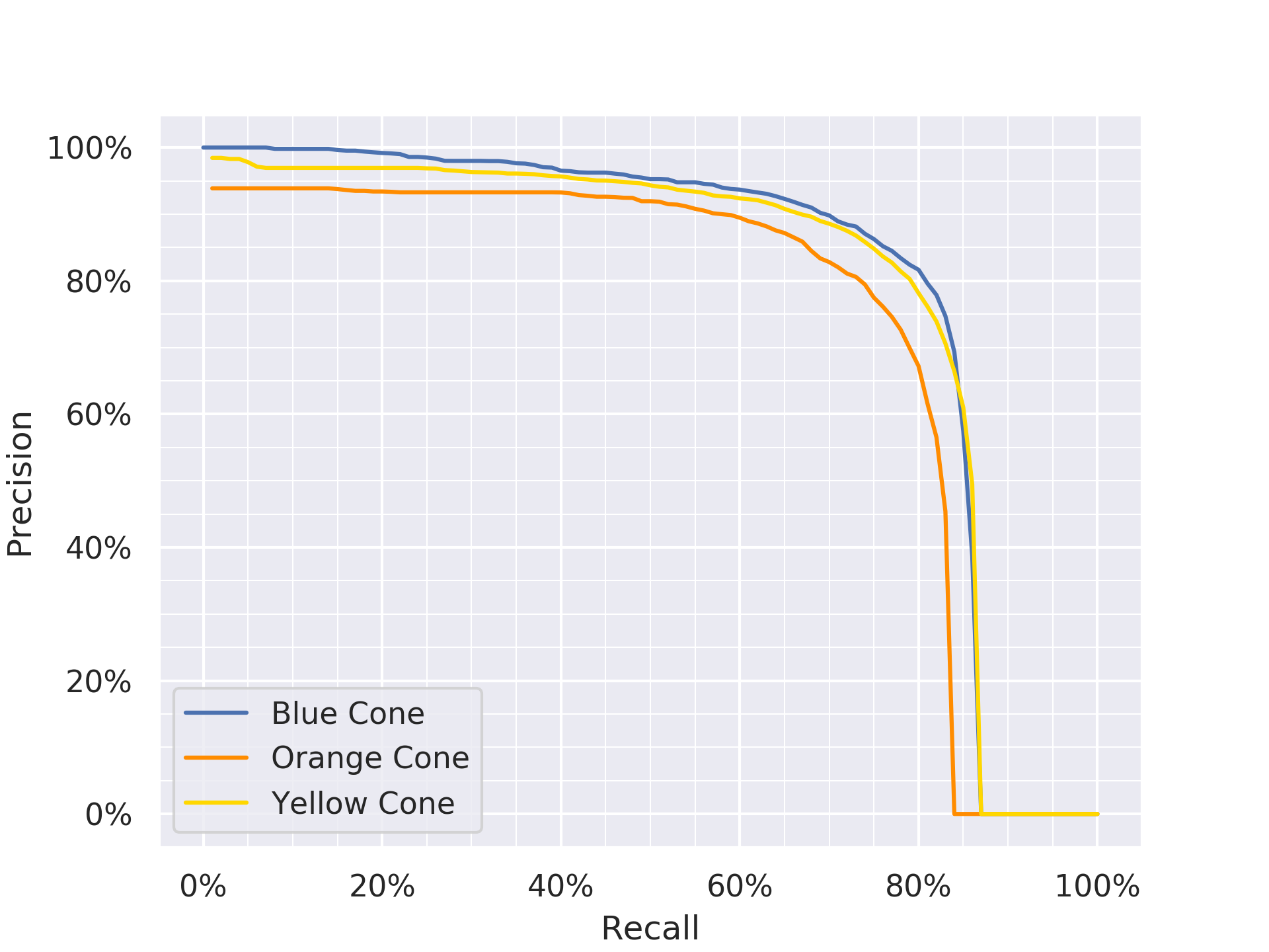 To minimise the number of false positives, we would like to have high precision, while maintaining a reasonable recall. For YOLOv4 Small-Object, at 90% precision, we have 75%, 80%, 85% recall for orange, yellow and blue cones respectively.